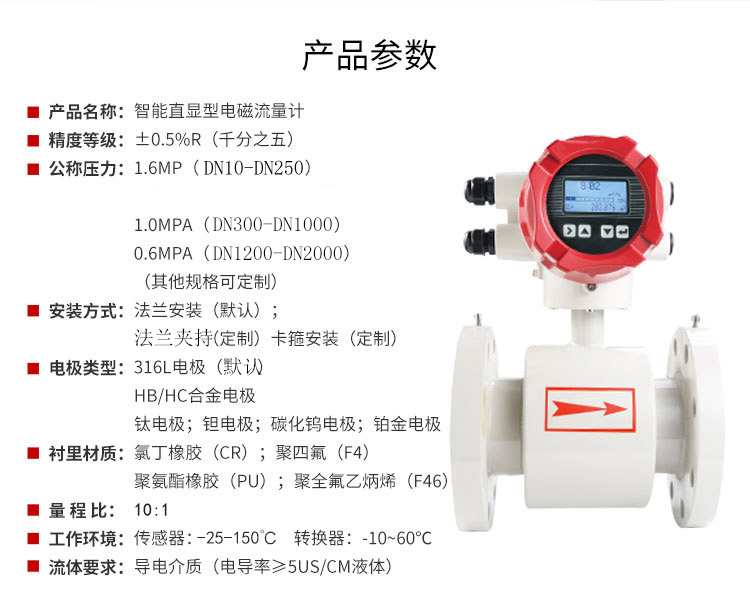 LDG-SPE升级款电磁流量计是根据法拉第电磁感应定律进行流量测试的流量计。电磁流量计的优点是压损极小,可测流量范围大。最大流量与最小流量的比值一般为10:1以上,适用的工业管径范围宽,最大可达3m,输出信号和被测流量呈线性,精确度较高,可测量电导率≥50μs/cm的酸、碱盐溶液、水、污水、腐蚀性液体以及泥浆、矿浆、纸浆等流体流量。
