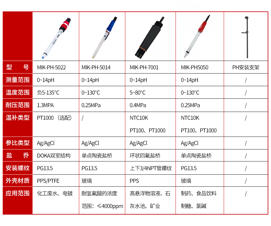 MIK-PH-5013A工业在线聚四氟电极采用聚四氟乙烯材质外壳,抗强酸强碱,耐腐蚀,适合恶劣环境使用。可根据客户需要加装各种温补型号PT100/PT1000/NTC 10K等。广泛应用于医药、颜料、涂料、纸浆造纸、中间体、化肥、淀粉、污水处理、环保、电镀废水处理等行业。